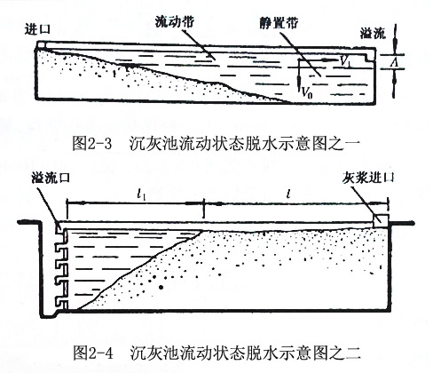 灰水流動狀態(tài)的脫水是灰水由沉灰池的一端進入,澄清水由另一端溢流排出的連續(xù)作業(yè),灰粒在灰水流中邊流動邊沉降。在沉灰池中灰水分為兩帶,上層灰水流動部分稱為流動帶,下層靜止沉降積灰部分稱為靜置帶(圖2-3和圖2-4)。沉灰池中粗、重顆粒,由于水力沉速快,穿過運動帶的時間很短,被灰水流攜帶向溢流口移動的距離也很短,故在沉灰池進口處快速沉降,而形成一個坡向溢流口的斜面。灰水不斷引進,澄清水溢流,斜面積灰層逐漸增高,待溢流水中含灰量超過允許限度(<0.1)時就關(guān)閉灰水進口閘門,再靜置一段時間后,入出澄清水就可以挖灰使用。
